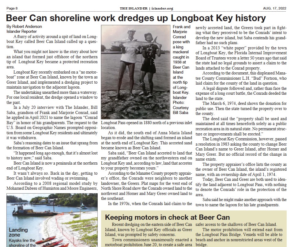 Frank Conrad’s greatest joy was his family. He enjoyed a long marriage with his wife Marjorie, had 2 children and 5 grandchildren. Frank discovered fishing and that became a lifelong passion. His favorite place to fish was Longboat Key. Frank and Marjorie deeded the immensely popular Beer Can Island to the State of Florida in the hopes of sharing the natural beauty and splendor of the island flora and sandy white beaches with the public for years to come.